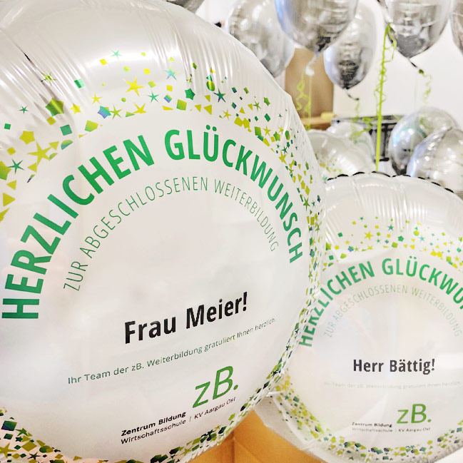 Gerne drucken wir Ihnen Ihren eigenen Folienballon mit Logo oder Werbetext. Auch eine direkte Ansprache auf dem Ballon ist möglich (z.B. Herzlichen Glückwunsch Frau Meier).